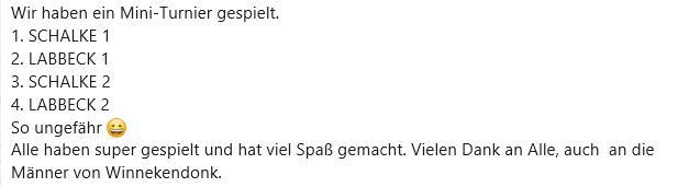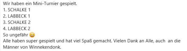 Am Mittwoch, 06.08.2025 traf sich die neu gegründete Schuffeltruppe am Sportplatz in Labbeck. Ab 9 Uhr wurde sauber gemacht. Zwischendurch gab es ein gespendentes Frühstück. Danach ging es mit neuer Kraft weiter. Zum Abschluss genossen wir noch ein Kaltgetränk. Die Leitung der Truppe hat Tom van Husen. Es wurde beschlossen, die Aktion alle 2 Wochen zu wiederholen.