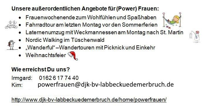 Wir sind sportinteressierte Labbeckerinnen, die sich regelmäßig zu den örtlichen Sportangeboten treffen. Weil wir uns selbst organisieren und mit viel Eigeninitiative dieses Sportangebot auf die Beine gestellt haben, nennen wir uns Powerfrauen. Wir sind der DJK BV Labbeck / Uedemerbruch angeschlossen.